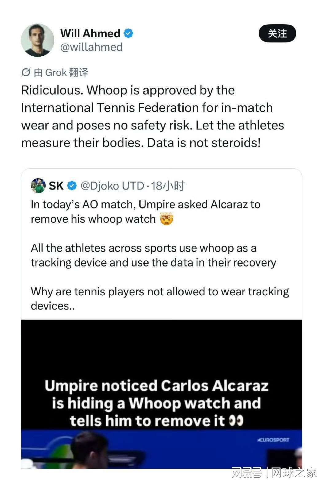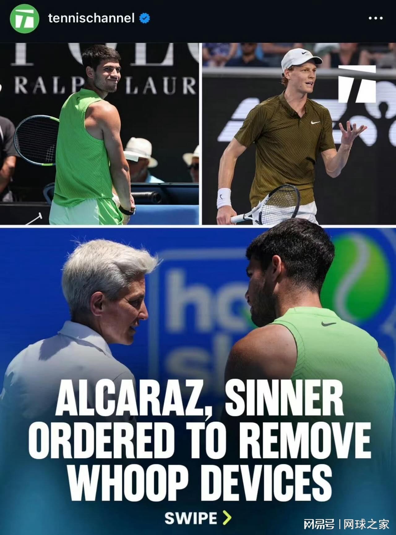 Whoop首席执行官在今天发文回应澳网禁止阿尔卡拉斯穿戴此设备一事时说道:“荒谬!Whoop已被国际网球联合会批准用于比赛中穿着,且不构成安全风险。让运动员测量他们的身体吧。数据不是类固醇!(之前辛纳兴奋剂事件)”